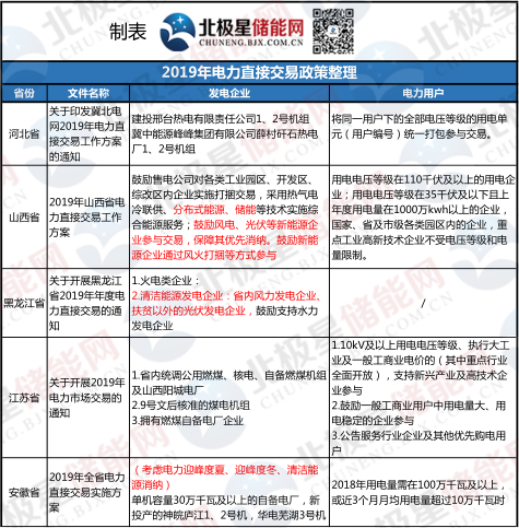不僅是山西省,近期多個(gè)省份發(fā)布了2019年電力市場(chǎng)交易通知,其中都有明確提到新能源發(fā)電可作為發(fā)電企業(yè)參與電力交易,北極星儲(chǔ)能網(wǎng)梳理了這些電力交易文件,詳表如下: