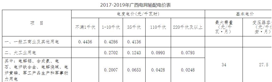 廣西電網(wǎng)2017-2019年輸配電價(jià)