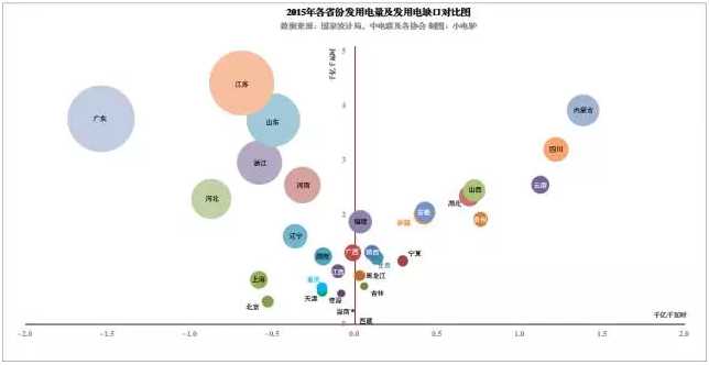 1、縱坐標(biāo)左方代表缺電的省份,用電缺口越大,縱坐標(biāo)右方代表電力富余的省份;上方代表發(fā)電量大的省份,越往上年發(fā)電量越大;圓餅面積越大代表年用電量越大;