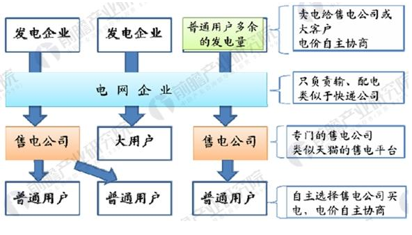 新電改之后,電力產(chǎn)業(yè)鏈主要特征是“放開兩頭,監(jiān)管中間”。其發(fā)電企業(yè)建立新的售電途徑,可直接賣電給大客戶,同時傳統(tǒng)向電網(wǎng)售電不變。中間環(huán)節(jié)電網(wǎng)公司只負責(zé)輸配電,成立專門售電公司,售電公司直接從電網(wǎng)購電出售給用戶,同時用戶也可自由選擇售電公司,使得電力交易更加深入市場化。