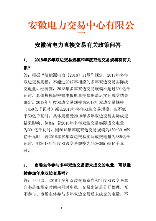 安徽電力交易中心日前發(fā)布《安徽省電力直接交易有關政策問答》,指出:經(jīng)測算,2018年多年雙邊交易規(guī)模不超過391億千瓦時。2018年年度雙邊...