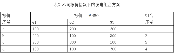 從上面的例子看,報價區(qū)的功率變化對關(guān)鍵支路的轉(zhuǎn)移分布因子,以及區(qū)域之間交易功率的極限,是與區(qū)內(nèi)發(fā)電的組合有關(guān)的。而在電力市場中,這個組合與發(fā)電的具體報價有關(guān)。表3給出了四種報價情況a、b、c及d。假設(shè)報價對應(yīng)的容量均為100MW。對發(fā)電機組的調(diào)用如果按照報價從低到高的順序,則可以得到對應(yīng)報價情況下的組合序號。比如,報價情況a下,G1的報價最低,因此當(dāng)區(qū)域1增加送出功率時,應(yīng)該全部由G1增加出力,對應(yīng)組合方案1;報價情況d下,G1和G2的報價相同,因此當(dāng)區(qū)域1增加送出功率時,由G1和G2按容量比例共同承擔(dān),即按照1:1比例分配出力,因此對應(yīng)組合4。