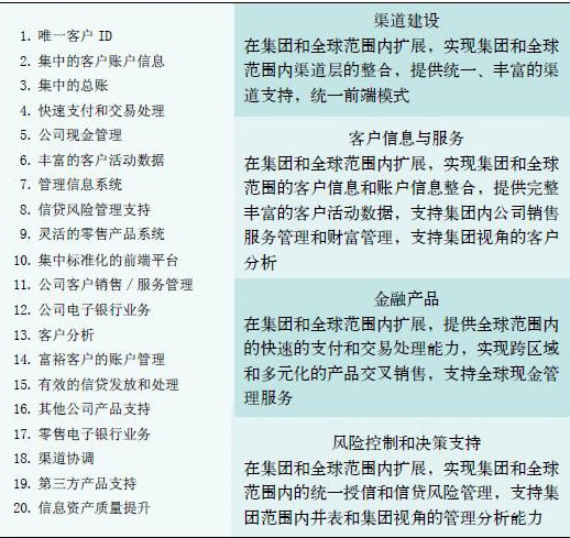 在渠道建設方面,需要實現集團和全球范圍內渠道層的整合,提供統(tǒng)一、一致、豐富的渠道支持;在客戶信息與服務方面,需要實現集團和全球范圍的客戶信息和賬戶信息整合,提供完整豐富的客戶活動數據,支持集團內公司銷售服務管理和財富管理,支持集團視角的客戶分析;在金融產品支持方面,需要提供全球范圍內的快速的支付和交易處理能力,實現跨區(qū)域和多元化的產品交叉銷售,支持全球現金管理服務;在風險控制和決策支持方面,需要實現集團和全球范圍內的統(tǒng)一授信和信貸風險管理,支持集團范圍內并表和集團視角的管理分析能力并支持巴塞爾Ⅲ的IT建設。