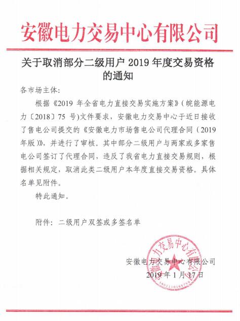大云網(wǎng)獲悉,安徽電力交易中心日前發(fā)布了《關(guān)于取消部分二級(jí)用戶2019年度雙邊交易資格的通知》,19家二級(jí)用戶因與兩家或多家售電公司簽訂代理合同,被取消本年度電力直接交易資格。