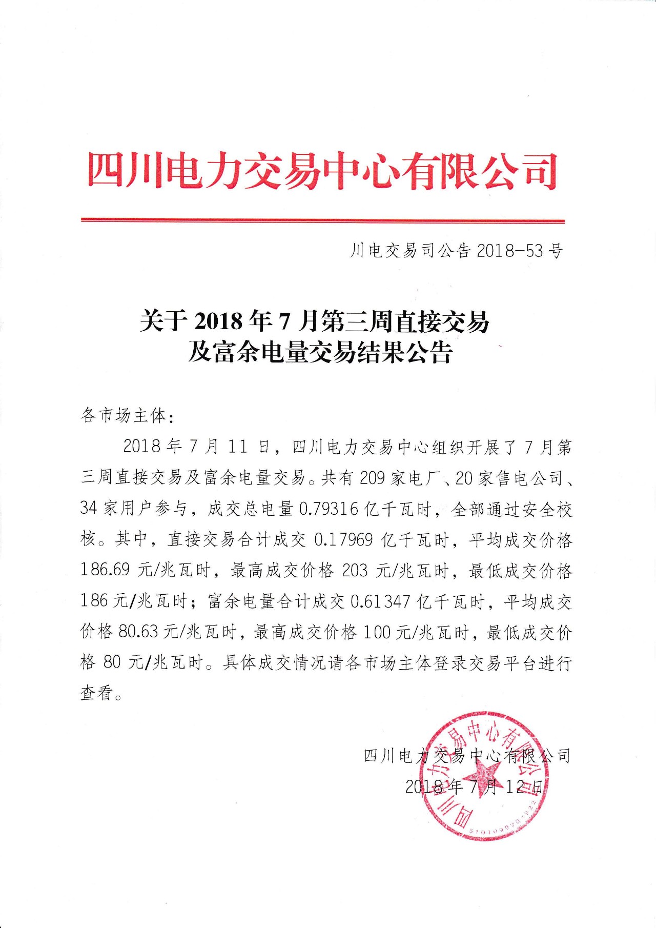 四川發(fā)布2018年7月第三周直接交易及富余電量交易結(jié)果