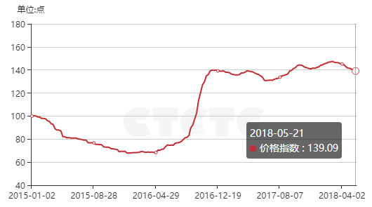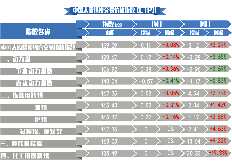 截至2018年5月21日,第250期中國(guó)太原煤炭綜合交易價(jià)格指數(shù)為139.09點(diǎn),環(huán)比上漲0.08%。其中:動(dòng)力煤指數(shù)120.67點(diǎn),環(huán)比上漲0.14%;煉焦用精煤指數(shù)167.35點(diǎn),環(huán)比上漲0.05%;噴吹用精煤指數(shù)160.03點(diǎn),環(huán)比持平;化工用原料煤指數(shù)125.49點(diǎn),環(huán)比持平。