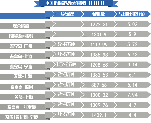 中國(guó)沿海(散貨)綜合運(yùn)價(jià)指數(shù)報(bào)收1222.31點(diǎn),較上周上漲5.0%。其中煤炭、糧食、金屬礦石、成品油運(yùn)價(jià)指數(shù)上漲,原油運(yùn)價(jià)指數(shù)維穩(wěn)?! ≈袊?guó)太原煤炭交易綜合價(jià)格指數(shù)為139.09點(diǎn),環(huán)比上漲0.08%。  秦皇島海運(yùn)煤炭交易市場(chǎng)發(fā)布的環(huán)渤海動(dòng)力煤價(jià)格指數(shù))571元/噸,環(huán)比下行1元/噸。