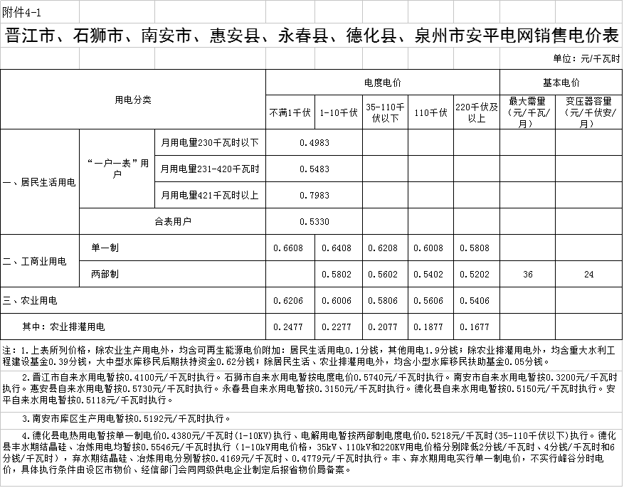 4.泉州市各縣級(jí)電網(wǎng)銷售電價(jià)表