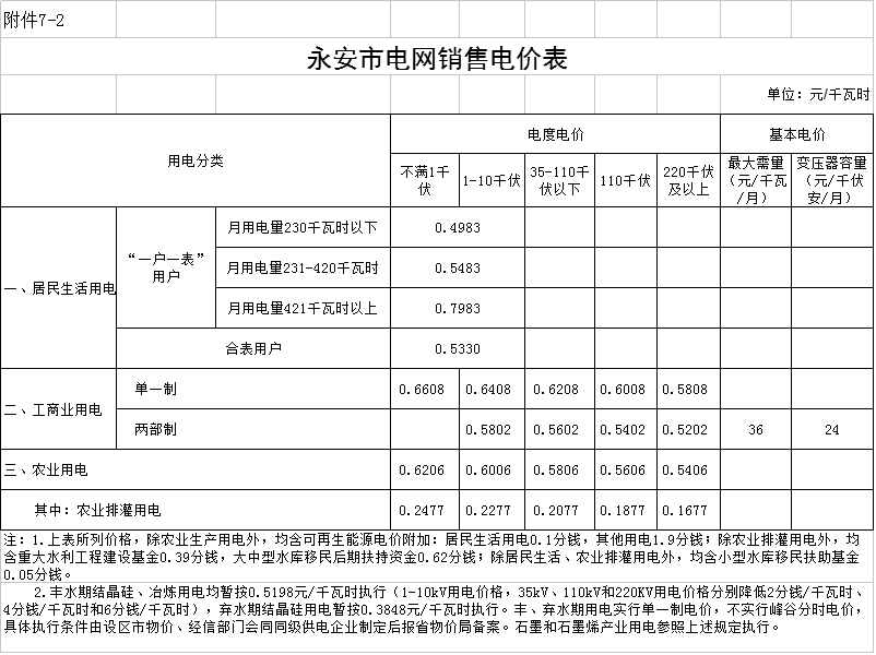 7.三明市各縣級(jí)電網(wǎng)銷售電價(jià)表