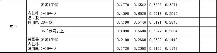 注:1.上表所列價(jià)格,除農(nóng)業(yè)生產(chǎn)中的貧困縣農(nóng)業(yè)排灌用電外,均含國家重大水利工程建設(shè)基金0.81分錢;除農(nóng)業(yè)生產(chǎn)用電以外,均含大中型水庫移民后期扶持資金0.62分錢、地方水庫移民后期扶持資金0.05分錢和農(nóng)網(wǎng)還貸資金2分錢;除農(nóng)業(yè)生產(chǎn)用電外,均含可再生能源電價(jià)附加,其中居民生活用電0.1分錢 、其余各類用電1.9分錢;核工業(yè)鈾擴(kuò)散廠和堆化工廠生產(chǎn)用電價(jià)格,按上表所列的分類電價(jià)降低1.7分錢(農(nóng)網(wǎng)還貸資金)執(zhí)行。