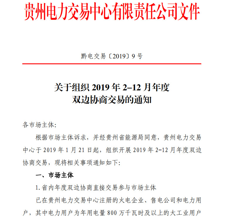 貴州電力交易中心發(fā)布了《關于組織 2019 年2-12月年度雙邊協(xié)商交易的通知》