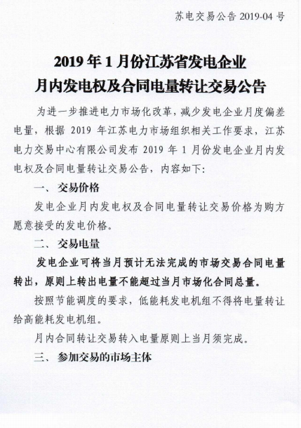 江蘇電力交易中心發(fā)布了《2019年1月份江蘇省發(fā)電企業(yè)月內(nèi)發(fā)電權(quán)及合同電量轉(zhuǎn)讓交易公告》