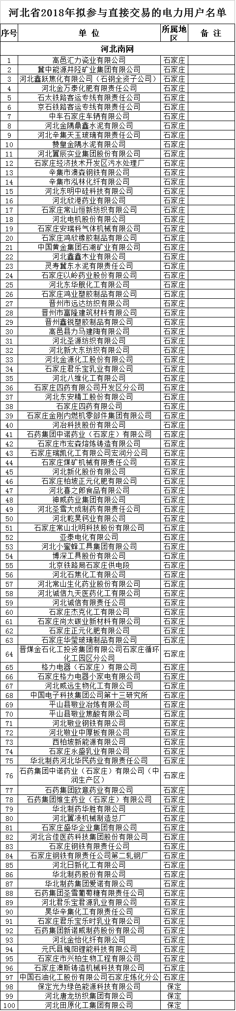 河北2018年擬參與直接交易的535家電力用戶及取消交易資格的12家電力用戶公示名單