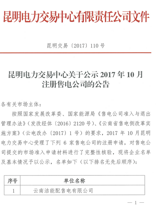 11月2日,昆明電力交易中心發(fā)布了《關(guān)于公示2017年10月注冊售電公司的公告》,公告中稱,10月昆明電力交易中心受理了下列6家售電公司的注冊申請,現(xiàn)將企業(yè)名單及基本情況公示,公示期為11月2日至12月1日。