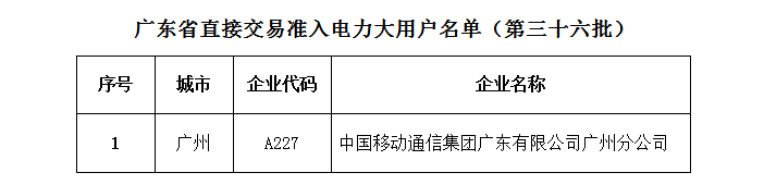 廣東省經(jīng)信委日前發(fā)布了第三十六批直接交易準(zhǔn)入電力大用戶名單,認(rèn)定中國移動(dòng)通信集團(tuán)廣東有限公司廣州分公司電力大用戶符合與發(fā)電企業(yè)直接交易擴(kuò)大試點(diǎn)準(zhǔn)入條件,詳情如下: