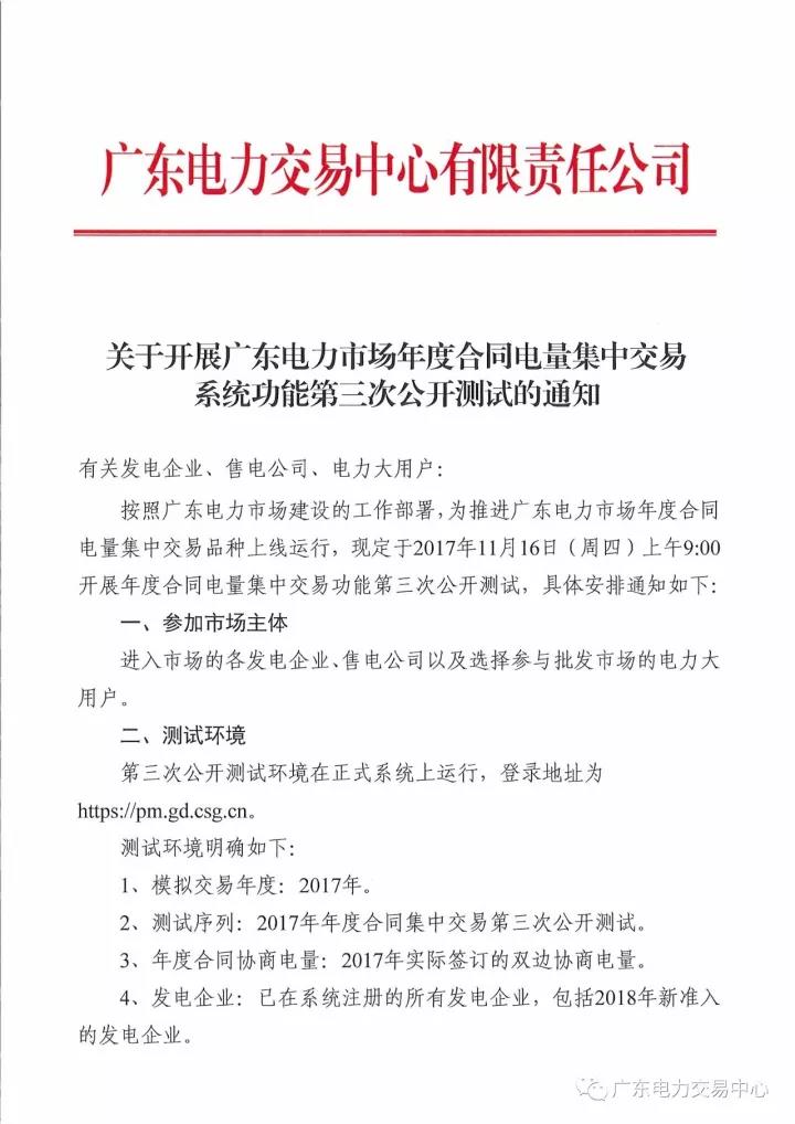 廣東發(fā)布《關(guān)于開展廣東電力市場年度合同電量集中交易系統(tǒng)功能第三次公開測試的通知》 16開始開展