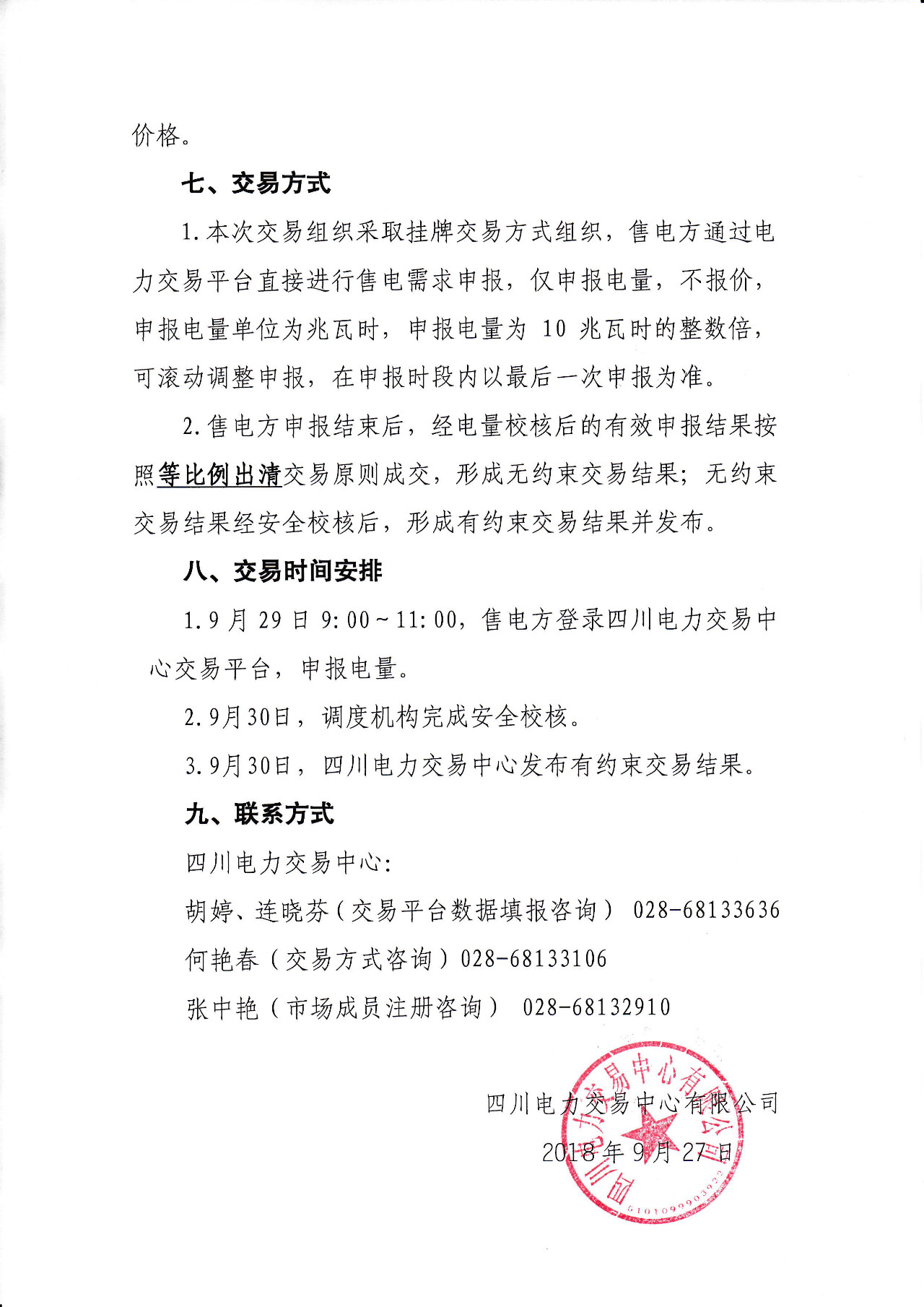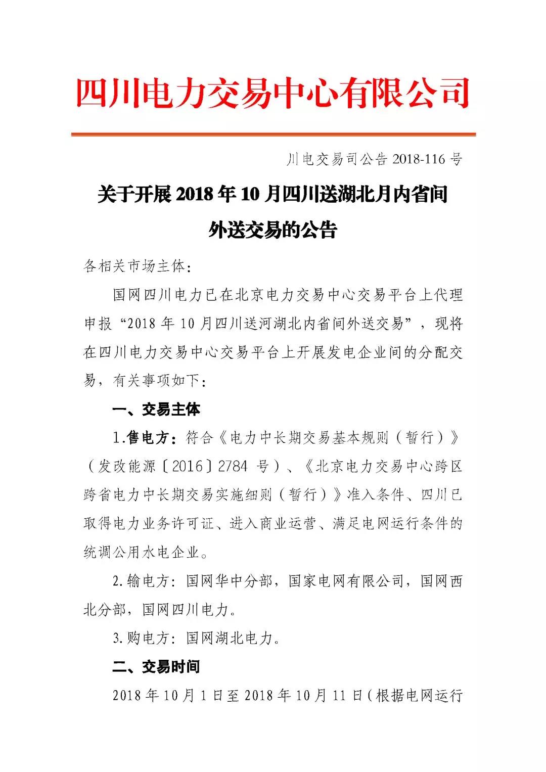 公告 | 關(guān)于開展2018年10月四川送湖北月內(nèi)省間外送交易的公告