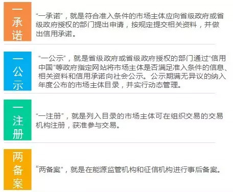 按照簡政放權(quán)的原則,《實(shí)施意見》對售電側(cè)市場的準(zhǔn)入和退出機(jī)制作了創(chuàng)新性安排,這是新一輪電力體制改革中的一個(gè)亮點(diǎn)。準(zhǔn)入機(jī)制方面,將以注冊認(rèn)定代替行政許可的準(zhǔn)入方式,以降低行政成本,實(shí)現(xiàn)有效監(jiān)管,提升工作效率,重點(diǎn)是“一承諾、一公示、一注冊、兩備案”。