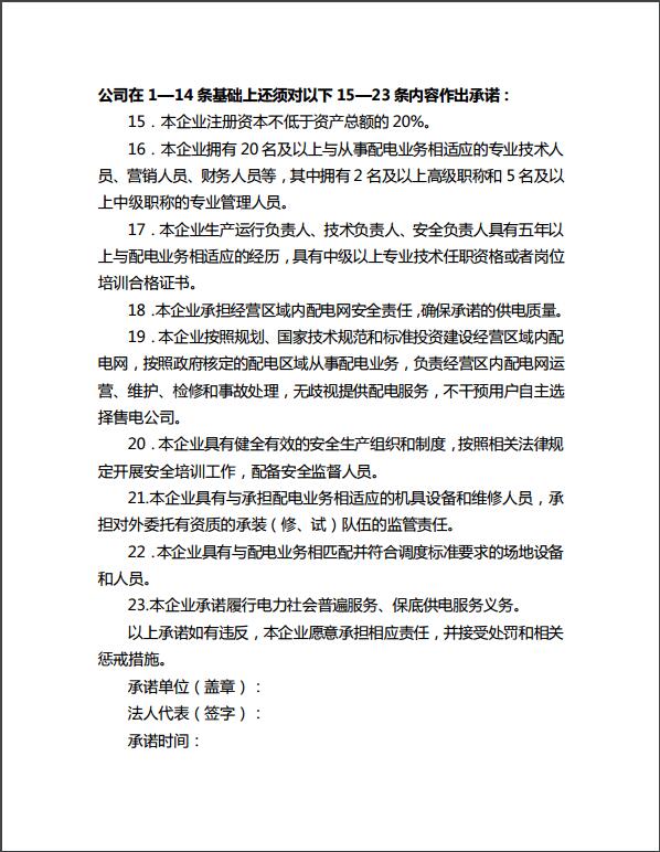 (八)承諾履行電力社會普遍服務(wù)、保底供電服務(wù)義務(wù)。