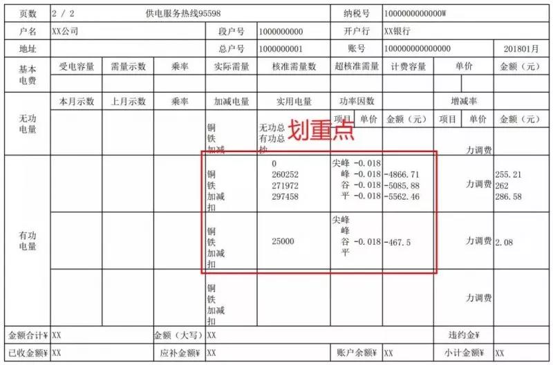 接下來我們翻到第二頁,這時我們發(fā)現(xiàn),第一頁中的峰平谷電量和定量25000千瓦時電量再次出現(xiàn)了,而且對應(yīng)的單價是一個負(fù)數(shù)。沒錯,這就是咱們當(dāng)月的優(yōu)惠電量了。江蘇省2018年電力市場用戶是全電量參與,因此咱們的每一度電都可以享受到優(yōu)惠。這里要注意,有的用戶會出現(xiàn)多行數(shù)據(jù),產(chǎn)生多頁核查聯(lián),但前后數(shù)據(jù)一定是一一對應(yīng)的哦。