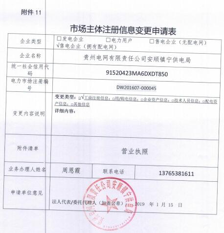 因凱里產(chǎn)投聚源配售電有限公司、粵電貴州電力銷售有限公司、貴州惠燃能源科技有限公司、貴州華網(wǎng)電力銷售有限公司、成都鐵路局貴陽(yáng)北供電段、成都鐵路局貴陽(yáng)供電段、國(guó)電貴州能源銷售有限公司、貴州電網(wǎng)有限責(zé)任公司安順市郊供電局、貴州電網(wǎng)有限責(zé)任公司安順鎮(zhèn)寧供電局等9家市場(chǎng)主體提出注冊(cè)信息變更申請(qǐng),按照《貴州省電力中長(zhǎng)期交易規(guī)則(試行)》(黔監(jiān)能市場(chǎng)〔2017〕112 號(hào))、《貴州省電力市場(chǎng)主體注冊(cè)管理辦法》(黔電交易〔2018〕154號(hào))相關(guān)規(guī)定,以上9家市場(chǎng)主體提交注冊(cè)信息變更資料通過(guò)貴州電力交易中心初步審核。