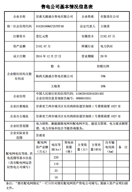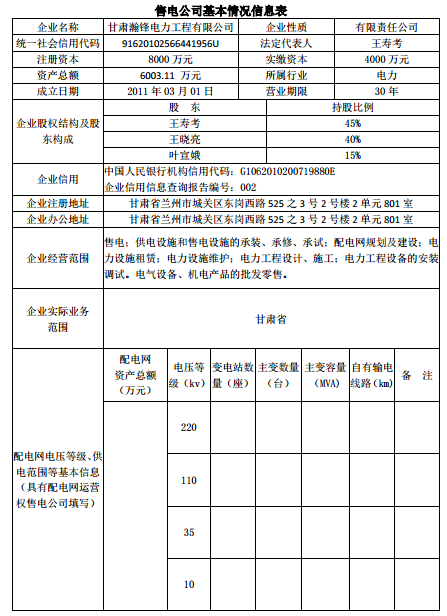 按照國(guó)家發(fā)改委、國(guó)家能源局《售電公司準(zhǔn)入與退出管理辦法》的要求,甘肅電力交易中心受理了下列售電公司的注冊(cè)申請(qǐng),對(duì)售電公司提交的市場(chǎng)準(zhǔn)入申請(qǐng)材料進(jìn)行了完整性核驗(yàn),現(xiàn)將企業(yè)名單及基本情況予以公示。