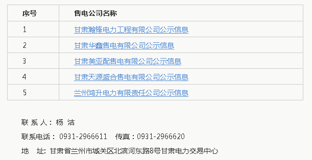 公示期間,任何單位和個(gè)人如有異議,可通過(guò)來(lái)電、來(lái)信、來(lái)訪等方式向甘肅電力交易中心實(shí)名反映。本次公示售電公司目錄如下:
