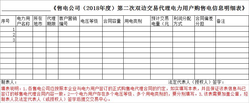 4.請(qǐng)各售電公司將2018年度第二次雙邊交易代理的全部用戶信息進(jìn)行匯總,填寫并提交《售電公司(2018年度)第二次雙邊交易代理電力用戶購(gòu)售電信息明細(xì)表》(見(jiàn)附件三),并嚴(yán)格按照填報(bào)說(shuō)明填寫。