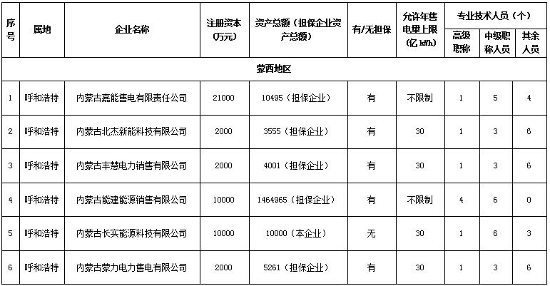 內(nèi)蒙古公示擬參與電力市場的19家售電公司和信息變更的1家售電公司