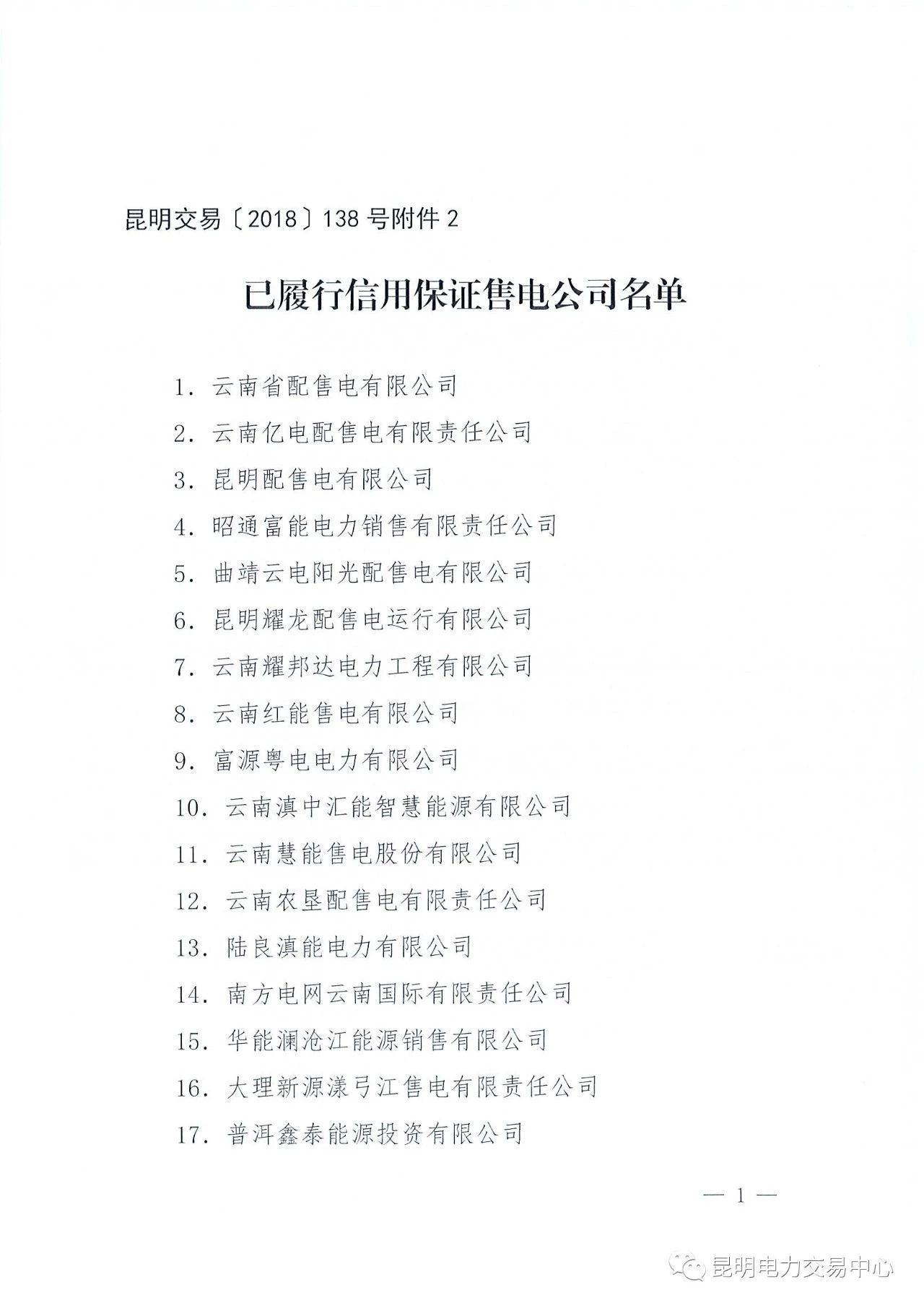 根據(jù)《關(guān)于印發(fā)208年云南電力市場(chǎng)化交易實(shí)施方案的通知》(云工信電力(2017)655號(hào))要求,列入目錄的售電公司履行信用保證后可具備入場(chǎng)交易條件。已履行信用保證售電公司名單,詳見附件2。