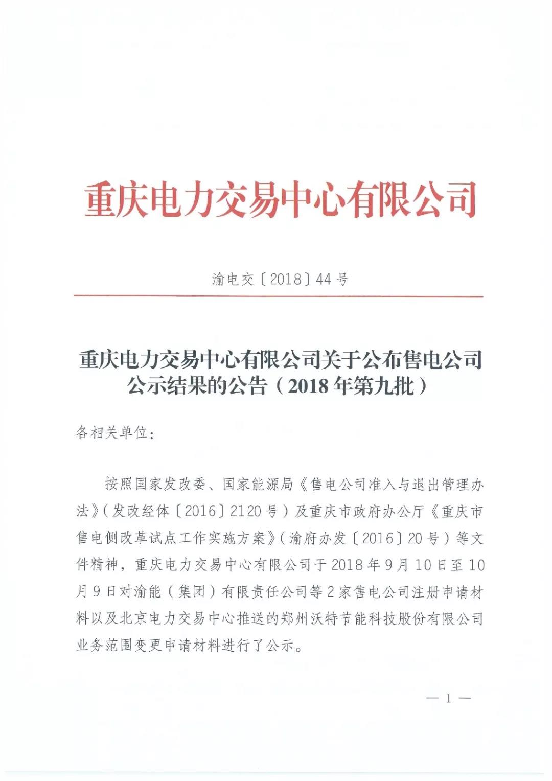 按照國家發(fā)改委、國家能源局《售電公司準(zhǔn)入與退出管理辦法》(發(fā)改經(jīng)體〔2016〕2120號)及重慶市政府辦公廳《重慶市售電側(cè)改革試點(diǎn)工作實(shí)施方案》(渝府辦發(fā)〔2016〕20號)等文件精神,重慶電力交易中心有限公司于2018年9月10日至10月9日對渝能(集團(tuán))有限責(zé)任公司等2家售電公司注冊申請材料以及北京電力交易中心推送的鄭州沃特節(jié)能科技股份有限公司業(yè)務(wù)范圍變更申請材料進(jìn)行了公示。