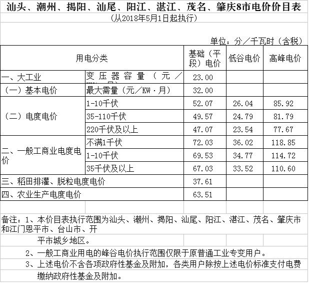 附廣東各地市電價(jià)表: