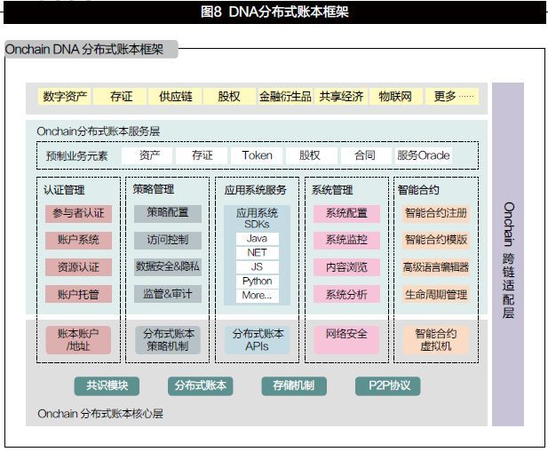 從2014開始區(qū)塊鏈平臺(tái)的設(shè)計(jì)與研發(fā),法鏈形成圖8顯示的DNA分布式賬本框架。它是以區(qū)塊鏈數(shù)字資產(chǎn)應(yīng)用為基礎(chǔ),可以靈活擴(kuò)展到各類業(yè)務(wù)應(yīng)用的綜合性分布式賬本框架體系。