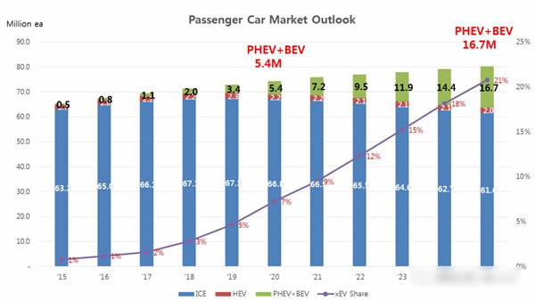 2017年多國紛紛推出禁止燃油車銷售時間表,與此相對應的是眾多汽車廠商分別投入巨資研發(fā)新能源汽車,大眾公司計劃在2025年推出80款電動或者混合動力車型供消費者選擇,戴姆勒-奔馳則計劃在2022年為其旗下所有的車型提供電動版本的選擇,隨著市場上可供選擇的電動汽車的種類的增多,電動汽車的市場份額也將逐漸增加,據樂觀估計到2025年PHEV和BEV將占據全球汽車銷量的21%左右。
