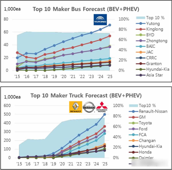 在電動大巴車方面中國廠家具有絕對優(yōu)勢,在排名前十的電動大巴車廠商中,中國廠家占據了9席(宇通、金龍、比亞迪、中通、北汽江淮、中國中車、廣通和亞星),并且這一優(yōu)勢還將持續(xù)擴大,在2025年排名前三的宇通、金龍和BYD在市場份額上將占據絕對優(yōu)勢。在電動卡車方面,則是日產、通用和豐田的天下,國內僅有長安和東風兩家上榜,而且這一差距還在持續(xù)還將持續(xù)擴大,長安、東風以及廣大的國內廠商還需要繼續(xù)努力,奮力追趕,爭取縮小與日產、通用等汽車廠商的差距。