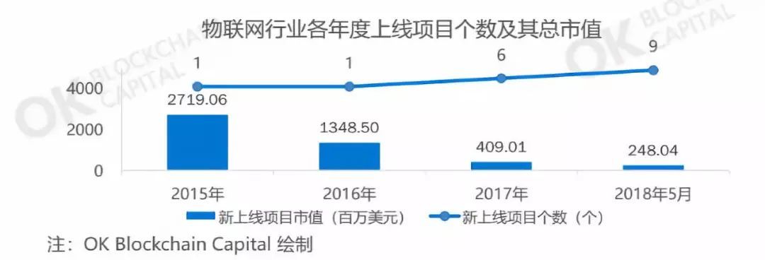 發(fā)展至今,連同供應(yīng)鏈項目在內(nèi),全球區(qū)塊鏈物聯(lián)網(wǎng)項目已有數(shù)十個。據(jù)不完全統(tǒng)計,全球已上線交易所的項目共17個,其中2018年最多,共有9個項目登陸交易所。物聯(lián)網(wǎng)行業(yè)各年度上線項目個數(shù)及其總市值 116億,全球已上線交易所的物聯(lián)網(wǎng)項目總市值為47.53億美元,平均市值2.97億美元。