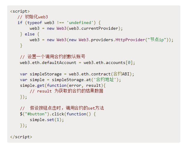 初始化web3設(shè)置一個(gè)調(diào)用合約的默認(rèn)賬號(hào)使用合約的ABI(二進(jìn)制接口信息)及合約地址 創(chuàng)建一個(gè)合約對(duì)象使用合約對(duì)象調(diào)用合約函數(shù)(如:把從合約中獲取的值顯示在界面中,用戶點(diǎn)擊界面調(diào)用相應(yīng)的合約函數(shù))