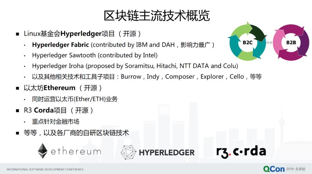 其實(shí)業(yè)界在區(qū)塊鏈的實(shí)現(xiàn)技術(shù)上有很豐富的類型,這列舉了一些影響力比較大的主流技術(shù)。其中一個(gè)在開(kāi)源界影響比較大的是 Linux 基金會(huì) Hyperledger 這樣一個(gè)傘形項(xiàng)目,下面包含了很多區(qū)塊鏈技術(shù)實(shí)現(xiàn)以及一些工具。其中獲得最廣泛采用的是 Hyperledger Fabric 這個(gè)項(xiàng)目,項(xiàng)目初期是由 IBM 和 DAH 一起貢獻(xiàn)的源代碼,現(xiàn)在全球參與的項(xiàng)目成員數(shù)量已經(jīng)是非常多了,其次還有 Sawtooth,Iroha 等等。
