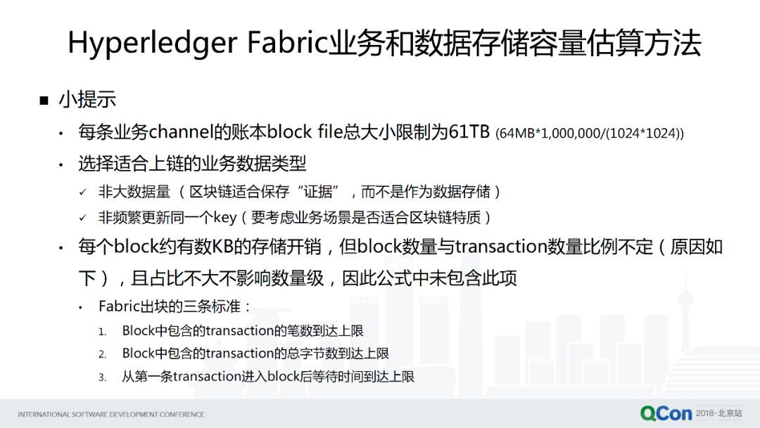 第二個(gè)就是我們要注意到底什么東西是適合放在區(qū)塊鏈的,這不僅僅是容量規(guī)劃的問(wèn)題,而是整個(gè)業(yè)務(wù)場(chǎng)景選擇的問(wèn)題,因?yàn)槭紫葏^(qū)塊鏈的特征是適合保存證據(jù),它不是用來(lái)作為原始的數(shù)據(jù)存儲(chǔ),或大數(shù)據(jù)存儲(chǔ)的基礎(chǔ)設(shè)施。另外的話,如果你的業(yè)務(wù)場(chǎng)景,頻繁地去更新同一個(gè) Key,比如銀行里面轉(zhuǎn)賬、支付交易,那么我們就要思考這種是否適合區(qū)塊鏈一個(gè)特質(zhì),因?yàn)閰^(qū)塊鏈在業(yè)界也有一個(gè)不成文的共識(shí),它本身不涉及用于支撐高頻交易業(yè)務(wù)的。另外還有 Block 開(kāi)銷(xiāo),因?yàn)閯偛胖v了 transaction 是封裝在 Block 里面的,這個(gè) Block 本身從數(shù)據(jù)結(jié)構(gòu)上大概有 1.9KB 的基本開(kāi)銷(xiāo),Block 數(shù)量跟 transaction 數(shù)量比例是不定的,因?yàn)橛邢旅鎺讉€(gè)原因,看到數(shù)字貨幣像比特幣,它的出塊是根據(jù)礦工挖礦,也就做一系列的窮舉計(jì)算以及做哈希計(jì)算得到一個(gè)滿足難度條件的隨機(jī)數(shù)等等,這是數(shù)字貨幣出塊。