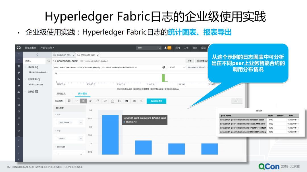 那么到底企業(yè)級(jí)的運(yùn)維與業(yè)務(wù)分析需要怎樣的 Fabric 日志的工具或者能力呢?其實(shí)這種區(qū)塊鏈的業(yè)務(wù)系統(tǒng)可以結(jié)合,比如說(shuō)云平臺(tái)的日志服務(wù),或者像開(kāi)源的 ELK 方案去搭建出日志分析系統(tǒng),去跟區(qū)塊鏈整合起來(lái)。下面舉幾個(gè)例子說(shuō)明我們需要哪些能力。第一個(gè)就是我們希望對(duì)區(qū)塊鏈業(yè)務(wù)系統(tǒng)的日志實(shí)現(xiàn)實(shí)時(shí)索引以及動(dòng)態(tài)查詢的能力。比如說(shuō)這個(gè)例子里面,我們是用阿里云的區(qū)塊鏈解決方案整合了阿里云日志服務(wù)來(lái)進(jìn)行示例,這里我們需要對(duì)某一個(gè)業(yè)務(wù) Channel 來(lái)進(jìn)行實(shí)時(shí)的索引查詢,來(lái)看這個(gè)日志的一些分布,以及跟這個(gè)業(yè)務(wù) Channel 相關(guān)的日志信息,可以通過(guò)關(guān)鍵字,以及像一些類 SQL 的查詢語(yǔ)句來(lái)快速實(shí)現(xiàn)查詢。