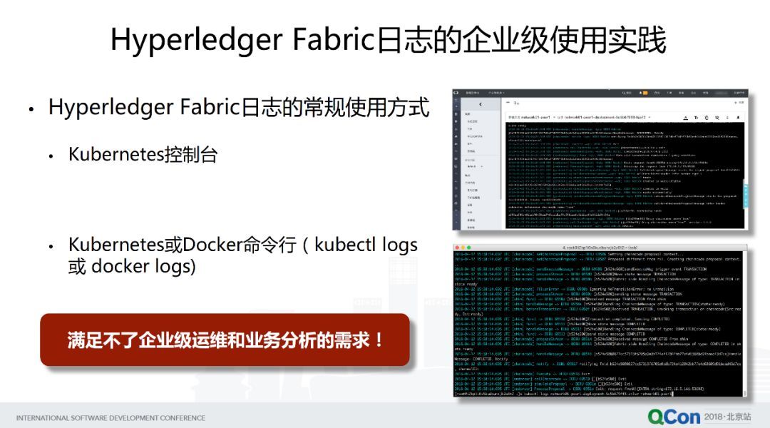 我們分享完第一個(gè)探索經(jīng)驗(yàn),下面將從運(yùn)維角度,怎么對(duì) Hyperledger Fabric 日志來(lái)實(shí)現(xiàn)企業(yè)級(jí)的運(yùn)維分析??赡茉谧暮芏嗤蕰?huì)有過(guò)使用 Fabric 日志的一些經(jīng)驗(yàn),比如說(shuō)我們可以通過(guò)像 Kubernetes 控制臺(tái),去查看某一個(gè) Peer 節(jié)點(diǎn)、Orderer 節(jié)點(diǎn)的日志信息,或者通過(guò)命令行運(yùn)行 kubectl logs 或 docker logs 命令,也可以看到每個(gè)節(jié)點(diǎn)的容器的日志信息。但問(wèn)題是這些手段滿足不了企業(yè)級(jí)運(yùn)維和業(yè)務(wù)分析的需求,這里所面向的對(duì)象很可能是區(qū)塊鏈運(yùn)維系統(tǒng)的團(tuán)隊(duì),甚至某些場(chǎng)合下會(huì)涉及到業(yè)務(wù)相關(guān)的團(tuán)隊(duì)。
