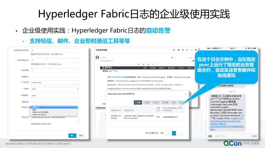 第二個(gè)例子,對(duì)企業(yè)來(lái)說(shuō),可能要對(duì)一些比較敏感的,或者是高優(yōu)先級(jí),或者是對(duì)風(fēng)險(xiǎn)有關(guān)的一些日志信息,實(shí)現(xiàn)自動(dòng)告警的功能,并且這些告警可以去對(duì)接,比如短信,郵件,企業(yè)及時(shí)通信工具如釘釘?shù)鹊纫恍┕ぞ?。在下面這個(gè)示例中,我們就可以去對(duì)某一個(gè)區(qū)塊鏈應(yīng)用系統(tǒng)來(lái)設(shè)定一些告警規(guī)則,檢查在某一個(gè) Peer 節(jié)點(diǎn)上是否有運(yùn)行某個(gè)特定,如某個(gè)高敏感性 chaincode 應(yīng)用,設(shè)置這樣一條規(guī)則,在配置好規(guī)則以后,后面當(dāng)我業(yè)務(wù)系統(tǒng)一旦滿足這個(gè)條件,那么就會(huì)自動(dòng)通過(guò)郵件,以及短信,向用戶自動(dòng)發(fā)送告警,并且運(yùn)維人員在告警記錄里面可以看到告警的這個(gè)過(guò)程。
