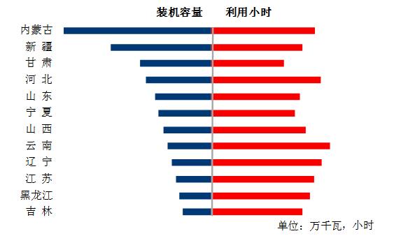 圖6 1-11月份風(fēng)電裝機(jī)較多省份風(fēng)電裝機(jī)容量和設(shè)備利用小時(shí)