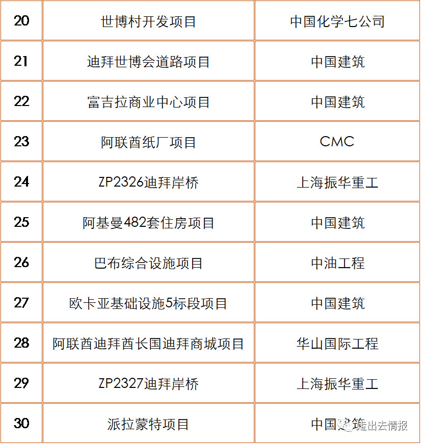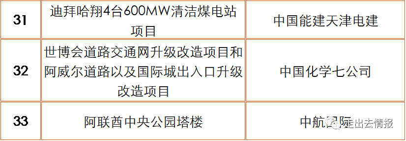 據(jù)《走出去情報(bào)》統(tǒng)計(jì),2017年中國(guó)企業(yè)在阿聯(lián)酋新簽500萬(wàn)美元以上工程承包項(xiàng)目近50個(gè),其中重點(diǎn)項(xiàng)目包括: