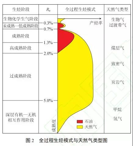 ③非常規(guī)連續(xù)型天然氣聚集理論,抓住了非常規(guī)天然氣分布的標(biāo)志特征,為頁(yè)巖氣等非常規(guī)天然氣的工業(yè)起步提供了有力的依據(jù)。此外,前陸沖斷帶構(gòu)造氣藏、深層海相碳酸鹽巖氣藏、大面積巖性氣藏、全過(guò)程生烴(圖2)等重要理論,高精度地震勘探、高效安全鉆完井、儲(chǔ)層壓裂改造增產(chǎn)等核心技術(shù),為推動(dòng)中國(guó)天然氣儲(chǔ)量快速增長(zhǎng)均發(fā)揮了重要作用。目前全國(guó)共發(fā)現(xiàn)氣田509個(gè),累計(jì)探明天然氣儲(chǔ)量13.4×10^12m^3,已建成長(zhǎng)慶、塔里木、四川3個(gè)儲(chǔ)量超過(guò)1×10^12m^3的大氣區(qū),為中國(guó)天然氣快速發(fā)展奠定了基礎(chǔ)。
