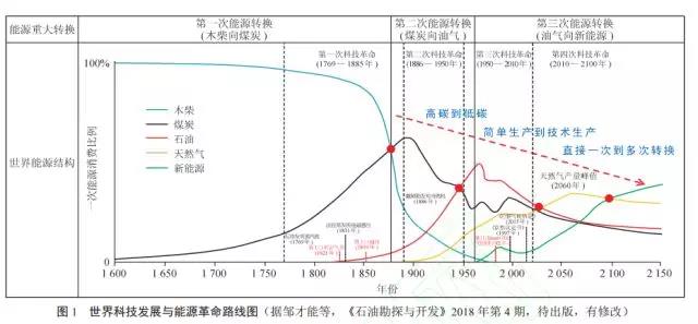天然氣作為最清潔的化石能源,是當(dāng)前滿足人類生態(tài)環(huán)境需求的最佳選擇,隨著生態(tài)環(huán)境需求的升級(jí)和科學(xué)技術(shù)的進(jìn)步,世界能源在21世紀(jì)中葉將進(jìn)入“天然氣新時(shí)代”(圖1)。能源消費(fèi)結(jié)構(gòu)進(jìn)一步向清潔化、低碳化加速轉(zhuǎn)變,2017年全球煤炭消費(fèi)比重下降了0.31%,天然氣和非水可再生能源消費(fèi)比重分別上升0.14%和0.16%。預(yù)計(jì)天然氣在2030年前后將超越煤炭、2040年將超越石油,成為向非化石能源發(fā)展路途上最主要的能源,進(jìn)入“天然氣時(shí)代”。最終,隨著經(jīng)濟(jì)社會(huì)對(duì)能源需求的持續(xù)增長(zhǎng)和低碳社會(huì)的到來(lái),傳統(tǒng)化石能源向非化石新能源的第三次重大轉(zhuǎn)換將成為必然(圖1)。