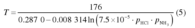 基于對應(yīng)態(tài)原理計算氯化氫和氨氣的逸度系數(shù),并根據(jù)化工熱力學(xué)數(shù)據(jù)手冊將氣態(tài)氯化氫、氣態(tài)氨氣以及固態(tài)氯化銨的代入上式,得到氯化銨結(jié)晶反應(yīng)達(dá)到平衡時,溫度與氣態(tài)反應(yīng)物分壓的關(guān)系。