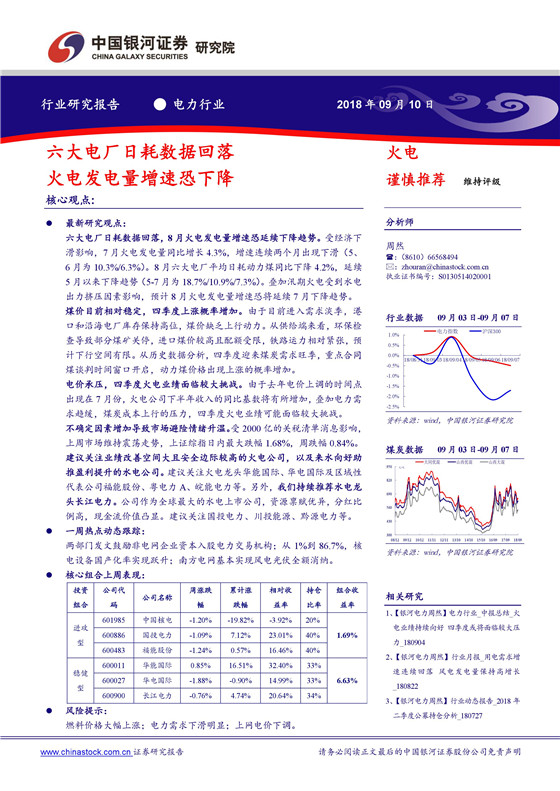 六大電廠日耗數(shù)據(jù)回落, 8 月火電發(fā)電量增速恐延續(xù)下降趨勢。 受經(jīng)濟下滑影響, 7 月火電發(fā)電量同比增長 4.3%,增速連續(xù)兩個月出現(xiàn)下滑( 5、6 月為 10.3%/6.3%)。 8 月六大電廠平均日耗動力煤同比下降 4.2%,延續(xù)5 月以來下降趨勢( 5-7 月為 18.7%/10.9%/7.3%)。疊加汛期火電受到水電出力擠壓因素影響,預(yù)計 8 月火電發(fā)電量增速恐將延續(xù) 7 月下降趨勢。煤價目前相對穩(wěn)定,四季度上漲概率增加。 由于目前進入需求淡季,港口和沿海電廠庫存保持高位,煤價缺乏上行動力。從供給端來看,環(huán)保檢查導(dǎo)致部分煤礦關(guān)停,進口煤價較高且配額受限,鐵路運力相對緊張,預(yù)計下行空間有限。從歷史數(shù)據(jù)分析,四季度迎來煤炭需求旺季,重點合同煤談判時間窗口開啟,動力煤價格出現(xiàn)上漲的概率增加。