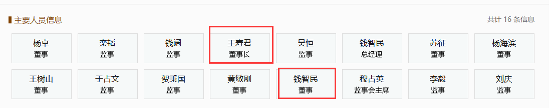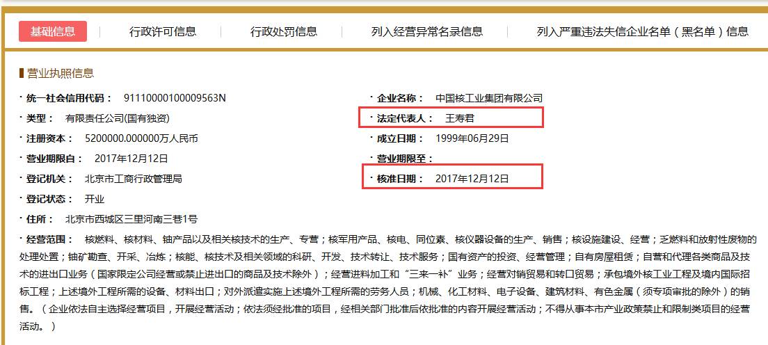 通過“國家企業(yè)信用信息公示系統(tǒng)”查詢顯示,公司制改制后,中國核工業(yè)集團有限公司董事長、法定代表人為王壽君;錢智民為公司董事。另外,公示系統(tǒng)也顯示了其他主要管理人員信息。
