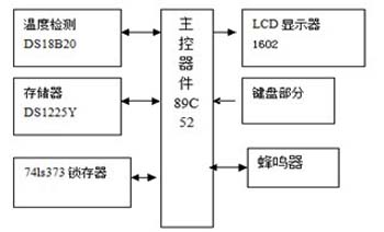 系統(tǒng)框如圖1所示。主控模塊用于控制其他模塊的運行和協(xié)作,其中我們利用測溫模塊得出的數(shù)據(jù)進行過濾存儲,并利用鍵盤接口查詢會顯出超出溫度范圍的數(shù)據(jù)和時間以備檢修人員查詢。